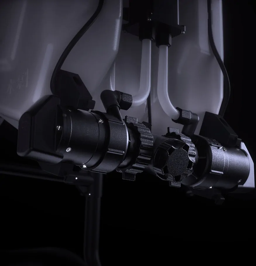 O sistema de pulverização do Agras T50 ajusta automaticamente parâmetros de voo e aplicação, garantindo cobertura uniforme em toda a área, mesmo em terrenos irregulares.